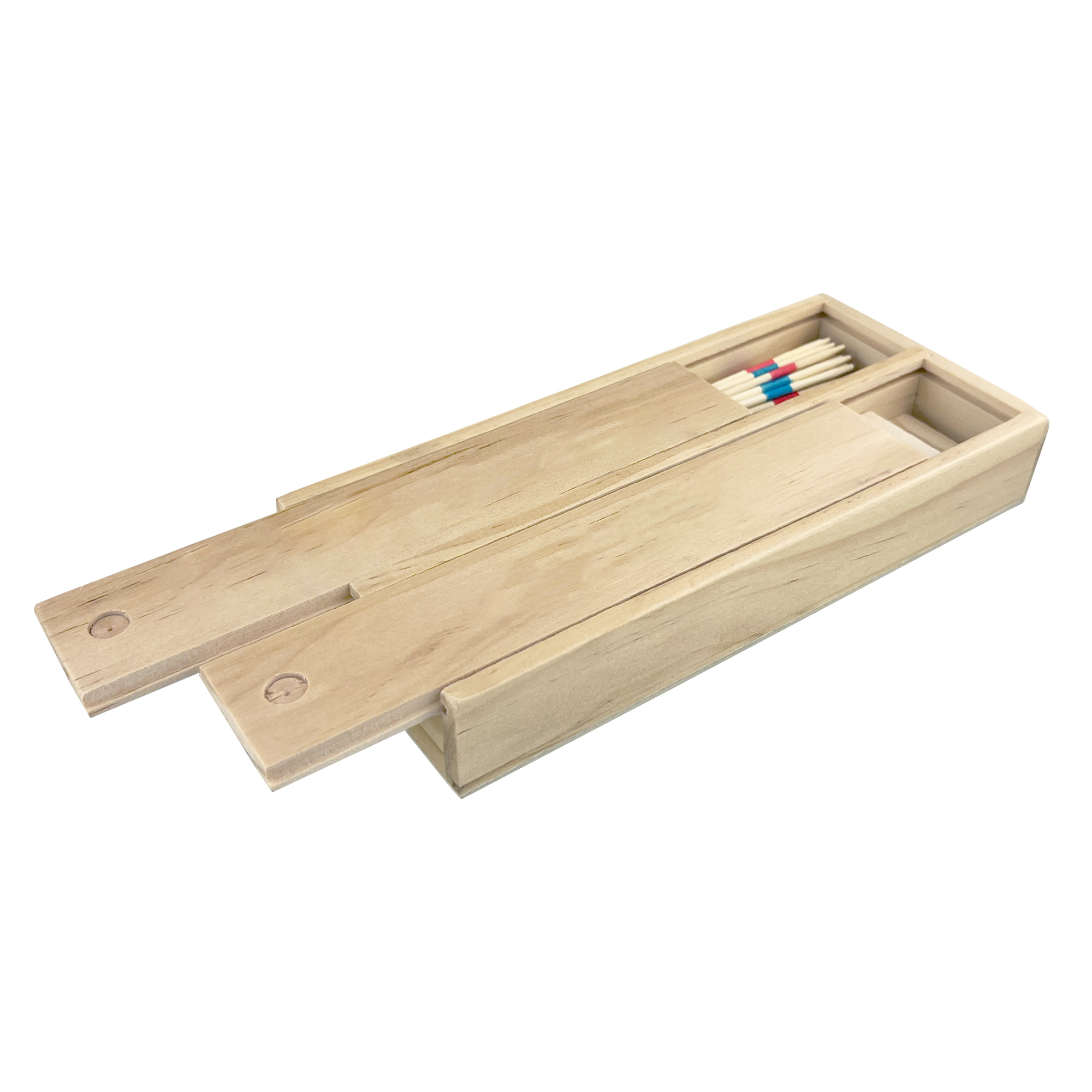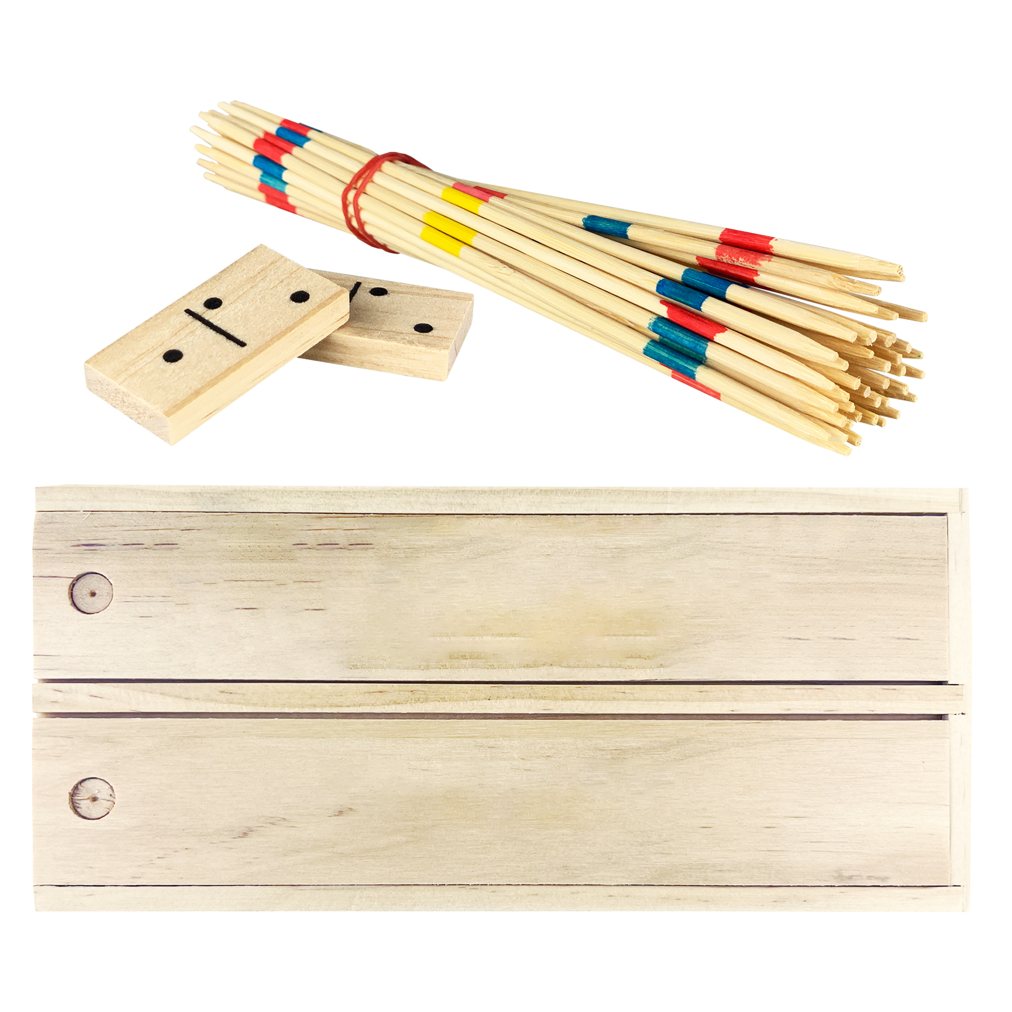 2 in 1 wooden play set is the perfect gift to hand out to those who enjoy playing wooden dominos and bamboo pick-up sticks. 41 bamboo sticks and 28 pine wood dominos packed into a pine wood box which has 2 compartments with 2 sliding lids. Comes with a playing instruction.