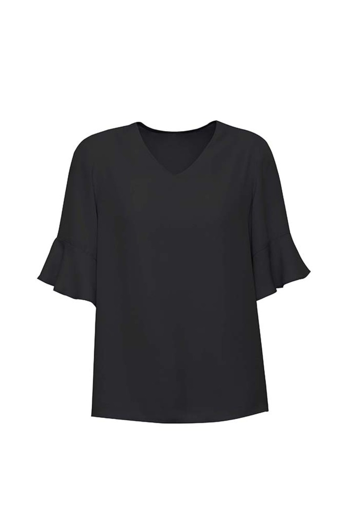 On-trend styling made from a luxurious lightweight breezy Georgette fabric with a beautiful surface texture and soft drape. Easy slip on style top with soft fluted sleeves. Straight hem cut, wear trucked in or out.
