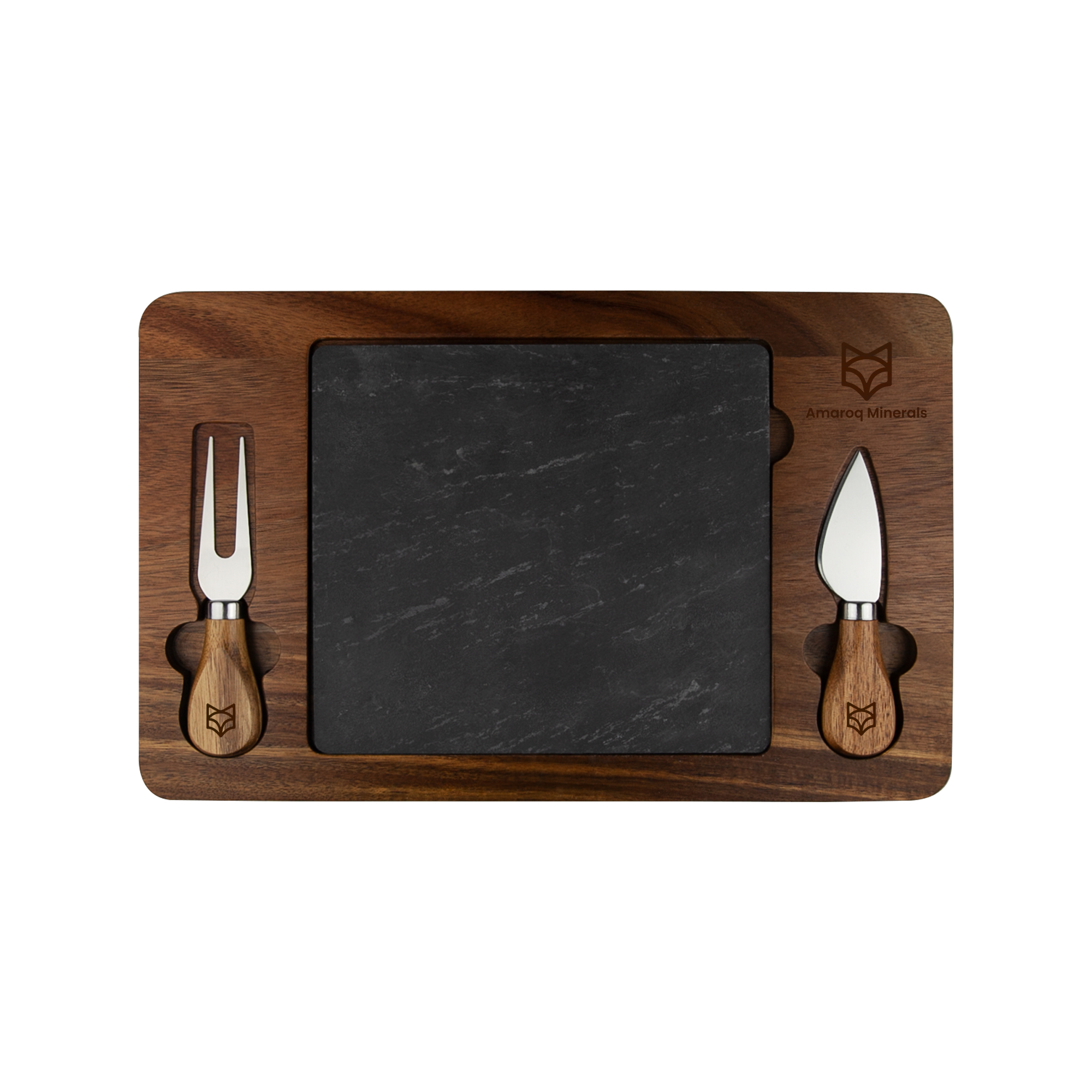 Serve in style with the sophisticated Hillside Slate Cheeseboard. Crafted from durable natural wood with a sleek removable slate insert, this cheeseboard offers the perfect balance of rustic charm and modern elegance. Complete with two premium cheese tools featuring smooth wooden handles with a magnetic hold. Ideal for hosting special occasions or looking for the perfect corporate gift, this cheese board adds a touch of artisanal warmth to every spread. Please note: The wood grain and tone may vary slightly from piece to piece.