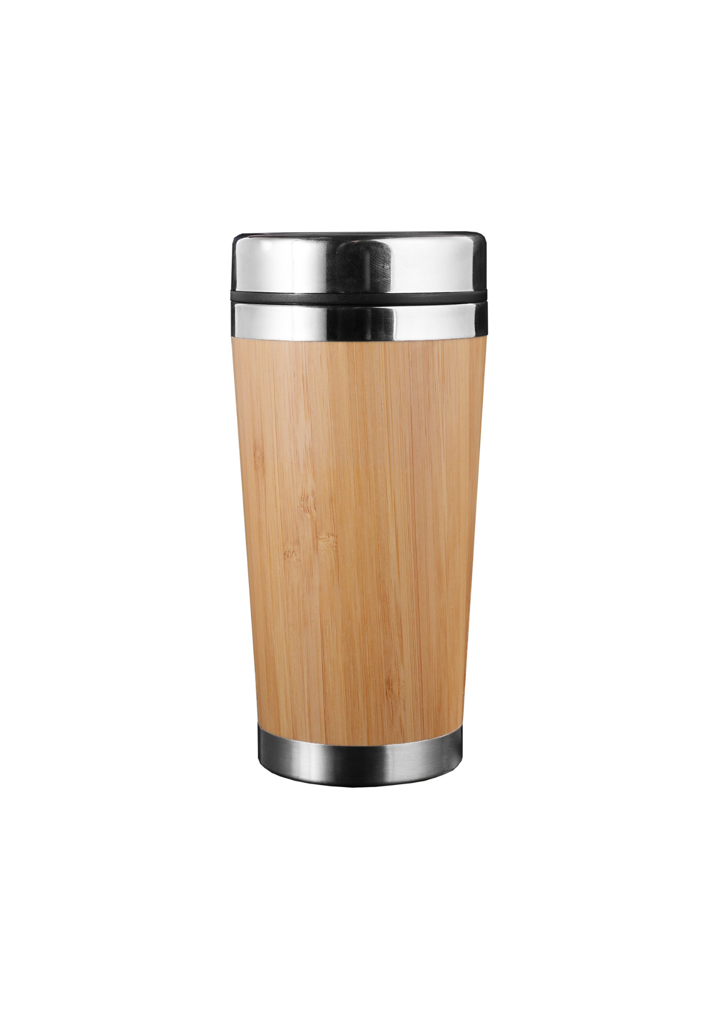 Popular 350ml classic design stainless steel double wall coffee cup is now given a new eco feature of natural bamboo outer wall which is made of sustainably sourced bamboo. It has a push on plastic lid with splashproof sliding closure and stainless steel ring matching stainless steel trims. Inner wall is made of 304 type of stainless steel and keeps drinks hot and cold longer. This cup is BPA-free and not microwave and dishwasher safe handwashing is recommended.