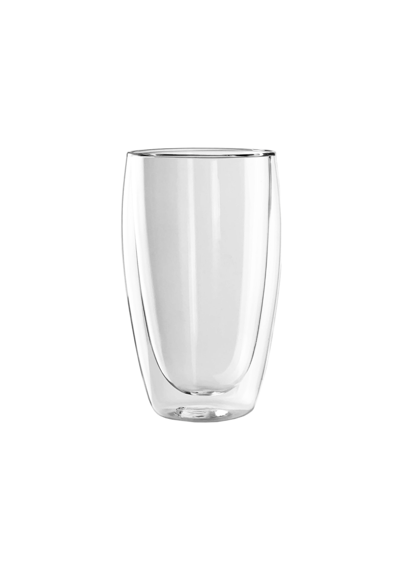 Tall 450ml double wall BPA free borosilicate glass cup that is both light weight and very strong. The ideal on-trend coffee cup for serving icy cold beverages. This cup is not dishwasher safe and handwashing is recommended.