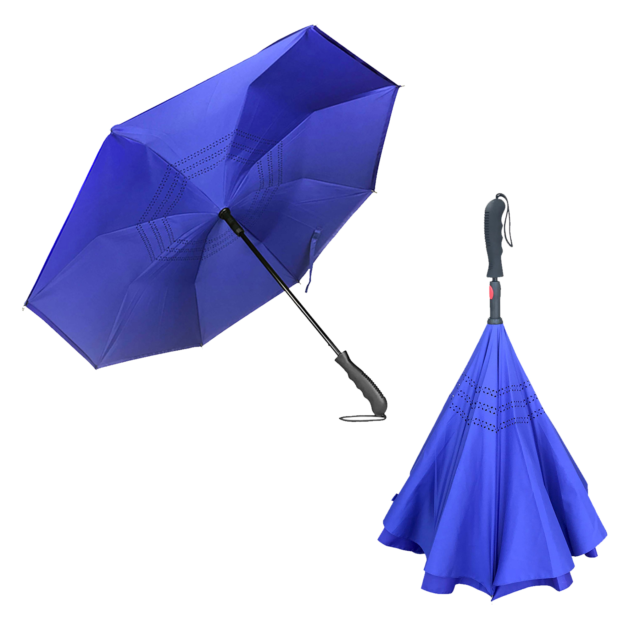 High quality inverted umbrella turns the traditional umbrella upside down and inside out easier to use and much more practical. Super simple to get in and out without getting wet it makes a waterproof cone when closed all the wetness stays inside not on your floor. 8 panel double layer 190T pongee wind proof canopy with auto opening and manual closing fiber glass ribs and metal shaft with black moulded soft-touch rubber handle which has a nylon wrist strap.