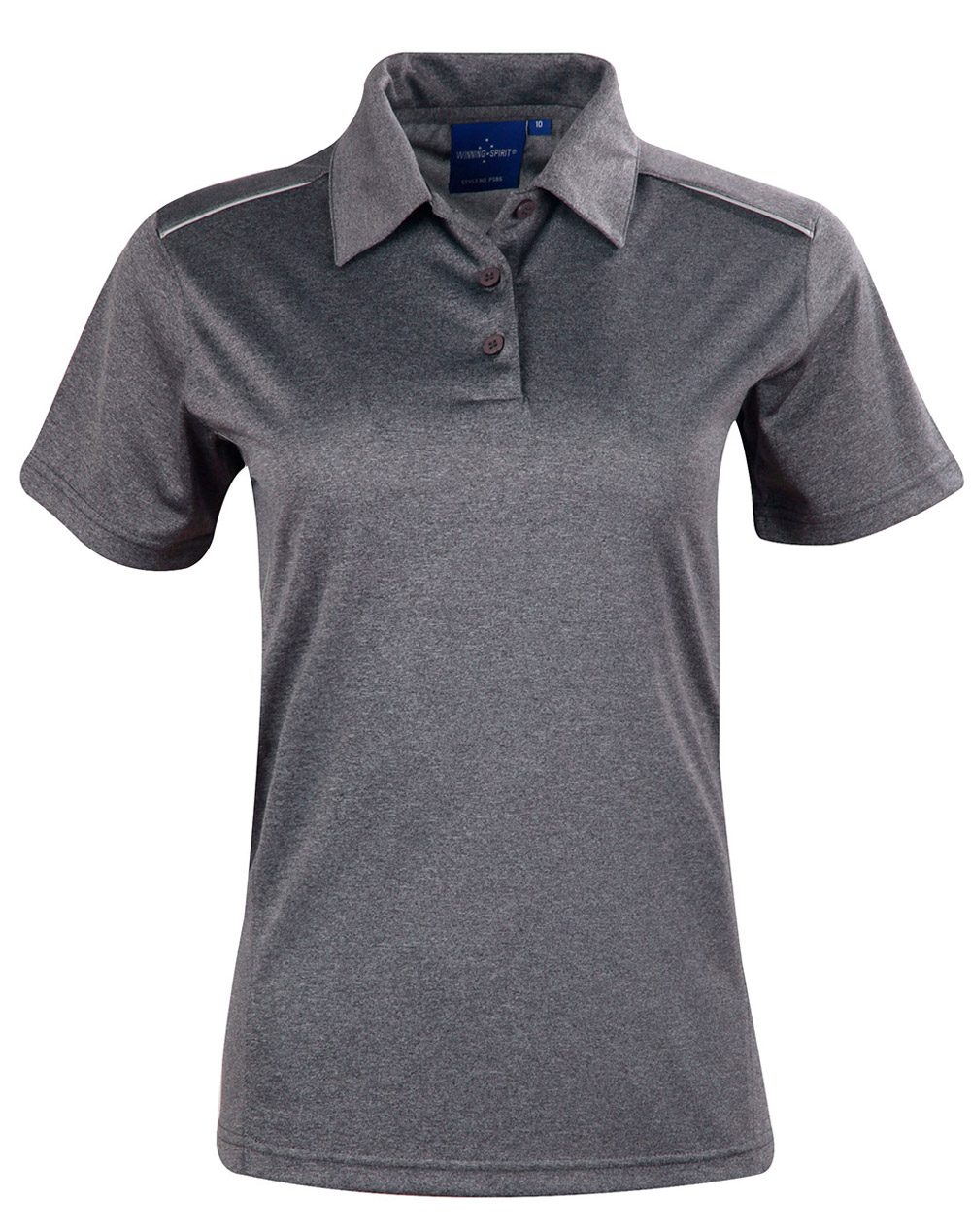 - This modern polo is made up of cationic heather fabric that produces flecks of grey in a frosty coloured style polo