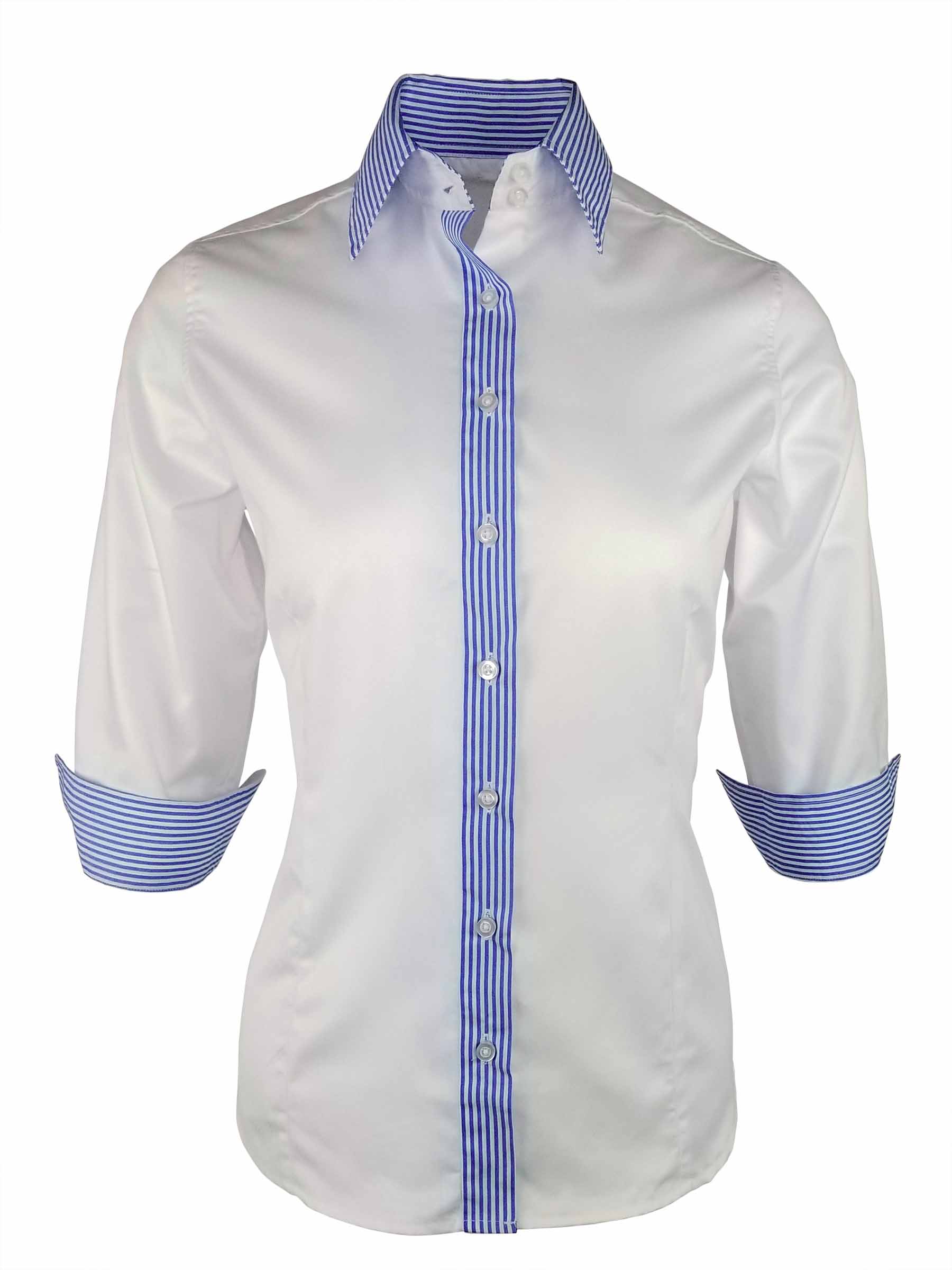This classic high quality white cotton blend shirt has been styled for the ultimate point of difference. A blue and white stripe has been featured thoughout with the entire collar and cuff in a classic stripe as well as the entire outide placket. Finished with white buttons it’s a stand out uniform option