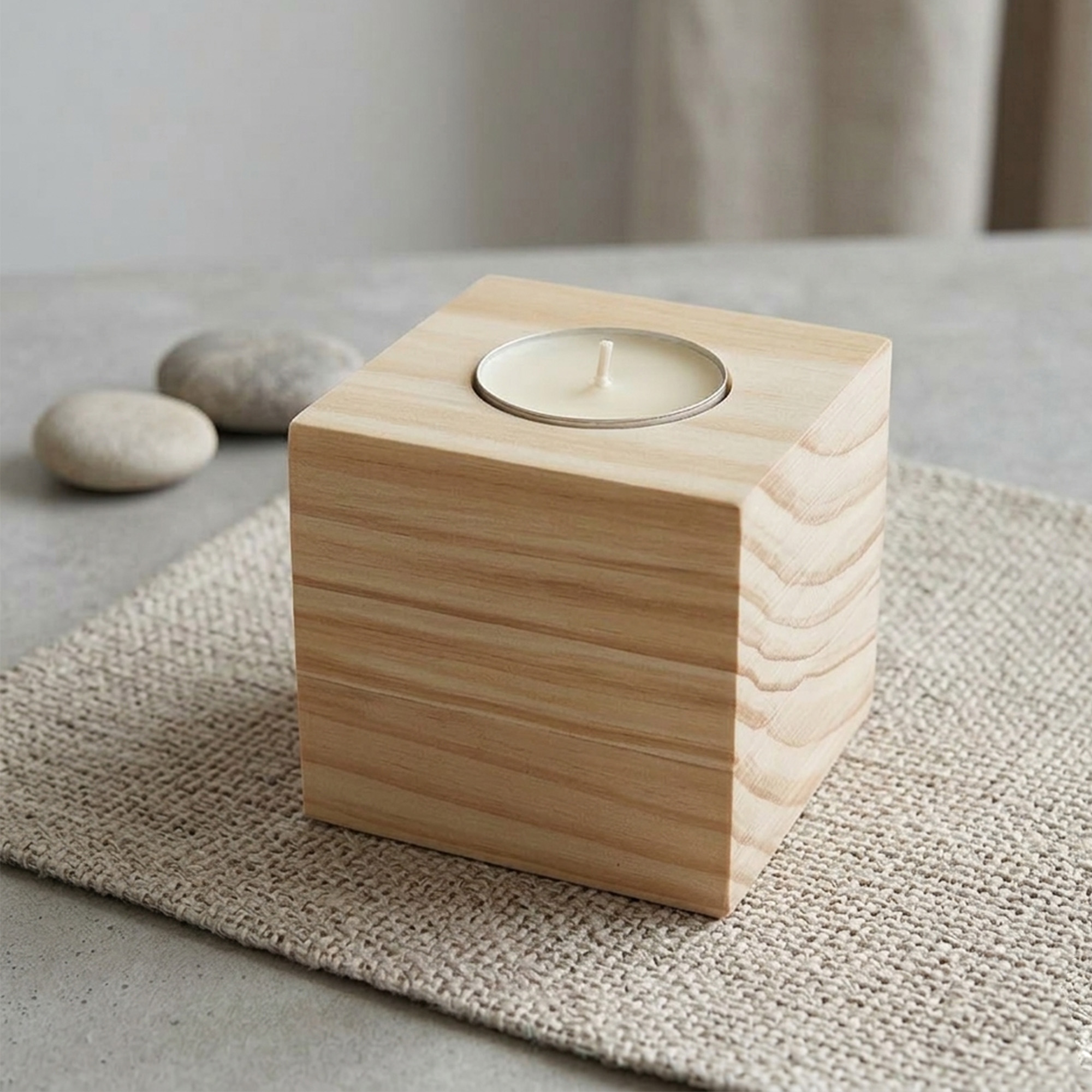 This wooden cube candle holder provides a refined surface for custom branding, creating a sophisticated and sustainable display for your company logo. The natural wood grain makes each piece unique, adding a premium touch to any desk or mantle. Designed as a reusable promotional gift, it includes a removable unscented tea light candle. Please note: Wood grain and colour may vary slightly between pieces.